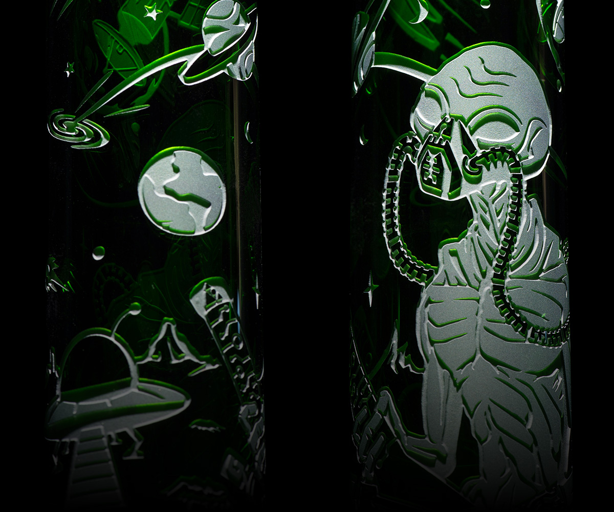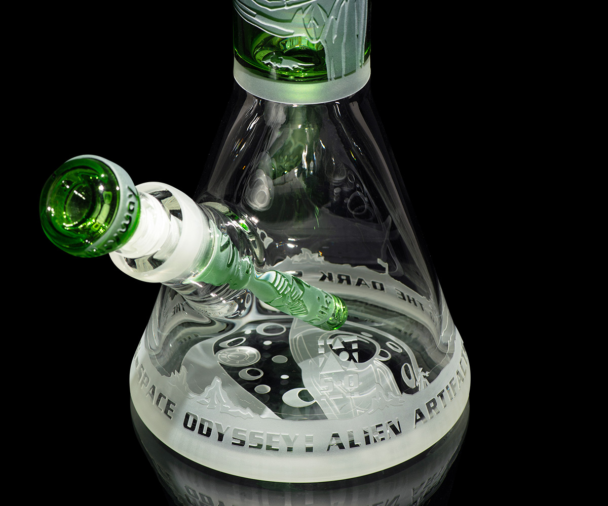 Dive into the cosmic mysteries with “Alien Artifacts” from our Space Odyssey Collection. This 16-inch piece intricately features Arilux, the Pherah scientist, etched into its double layer sandblast finish. Embodying classic and timeless Space Odyssey elements in its graphics, it includes a matching 6″ Space Odyssey stem and an Orbit bowl. Perfect for collectors and enthusiasts alike, “Alien Artifacts” offers a connection to the profound story of Arilux and the advanced Pherah race.