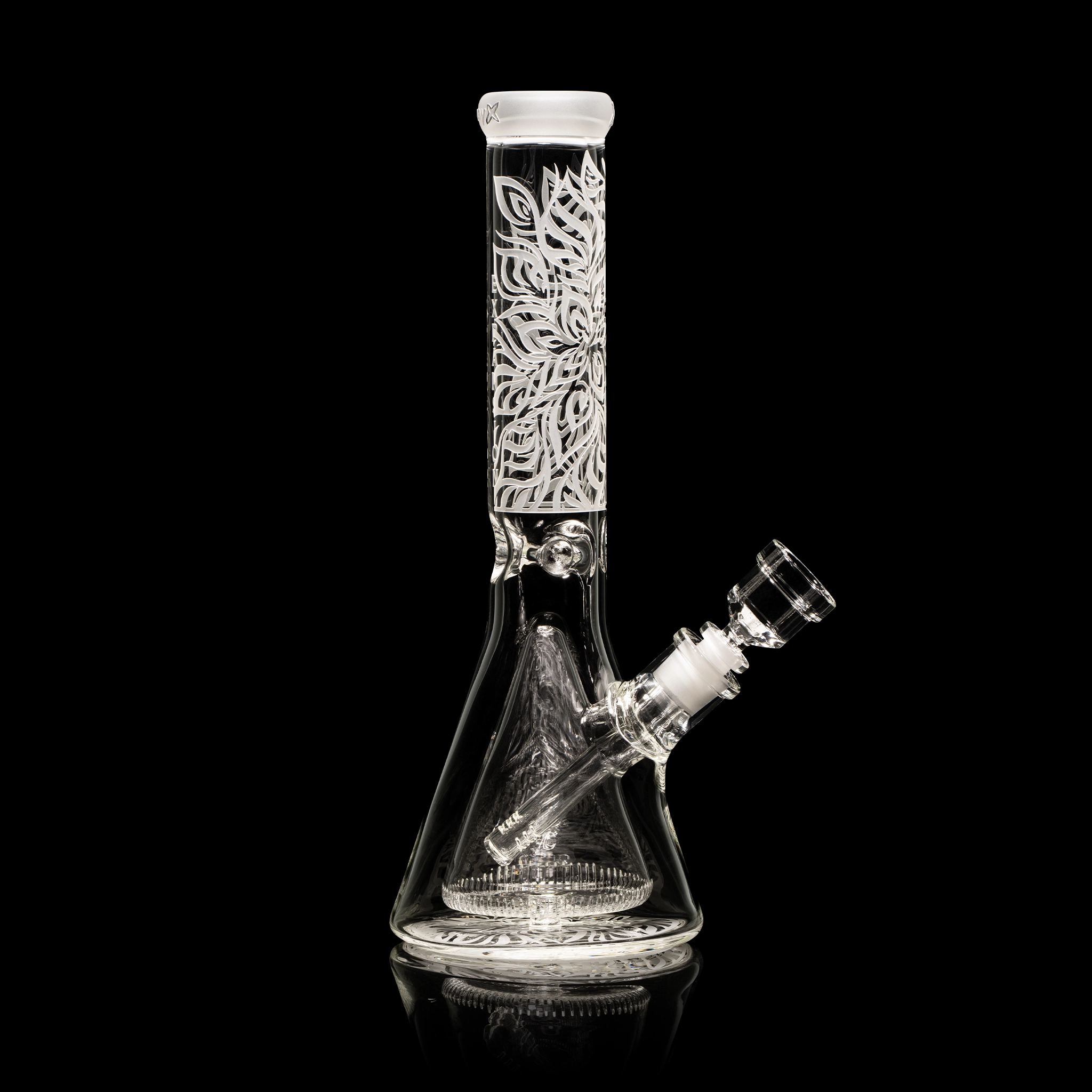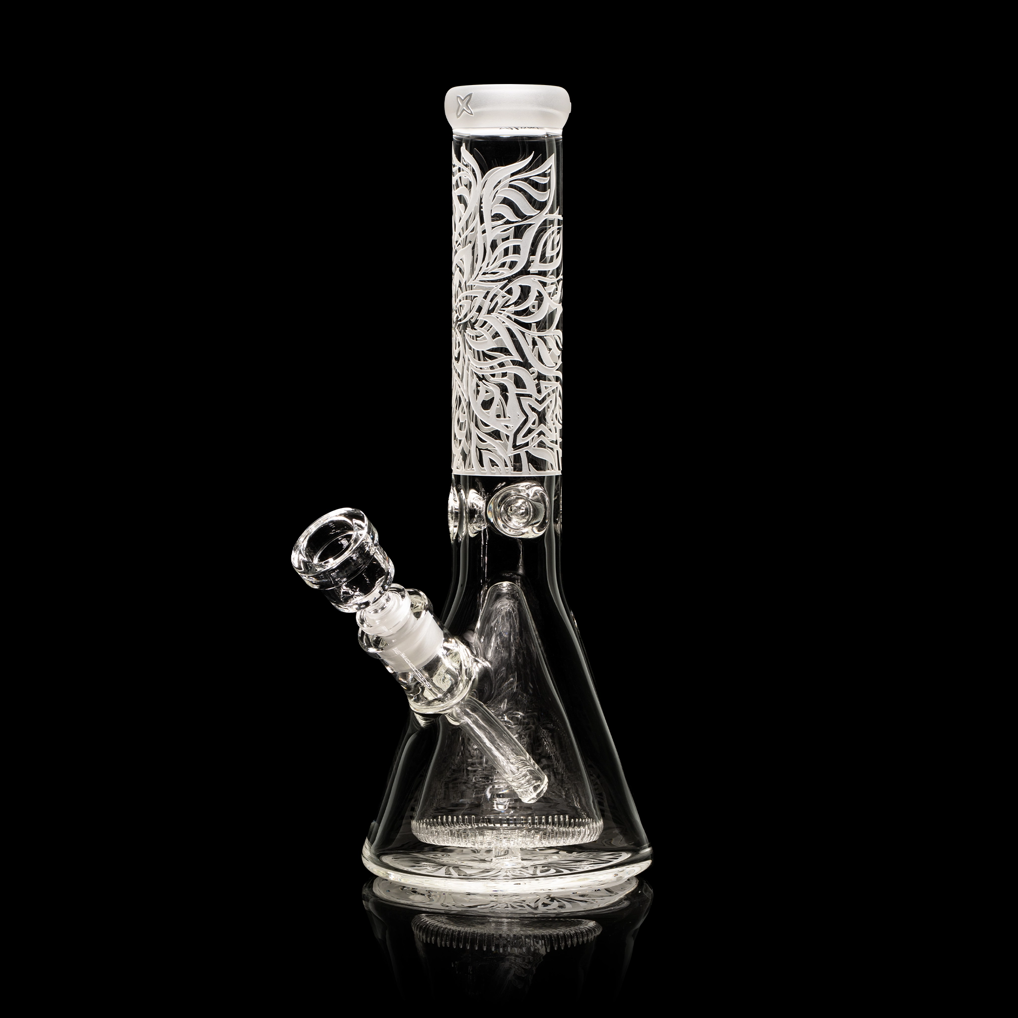 Expansion is a 14” beaker with a single-layer sandblast that pushes the limits of space and structure. The design plays with dimensional patterns and futuristic forms, set on thick, durable glass. It contains a Collins perc. Comes with a 5.5” downstem and bowl.