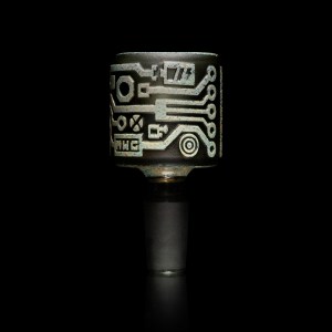 This extremely detailed bowl is part of the Milkyway signature Circuitboard collection, in a sub-category we call ‘Shadow Art’. It’s made with a smokey colored tube and color glass, and sandblasted deep. It’s the perfect upgrade for anyone with a Circuitboard Shadow Art beaker (MK-119), Classic beaker (MK-9) or sidecar (MK-18).