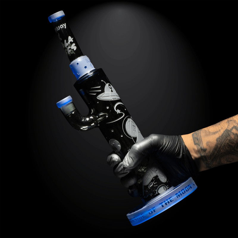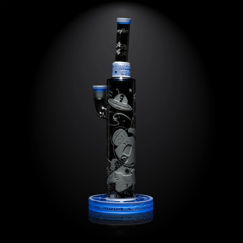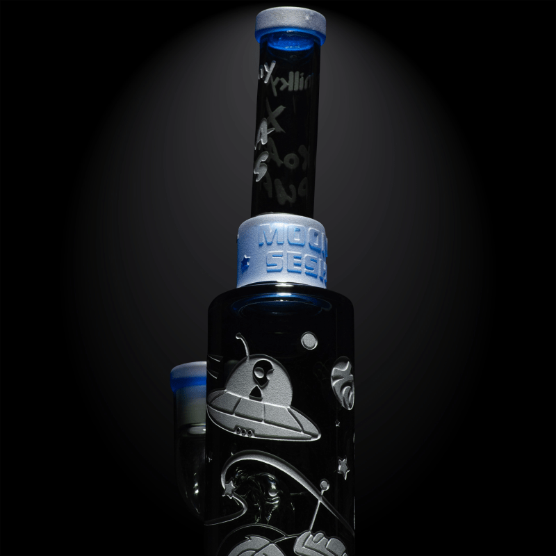 Milkyway and Koala Puffs are proud to present ‘Space Puffs’! This pufftastic special edition series tells the tale of the time Koala received an invitation for a session on the moon hosted by the Milkyway crew! The ‘Moon Sesh’ rig is a 12″ tall waterpipe with intricate sandblast details covering every part. A visual masterpiece! Equipped with a downtree percolator, it guarantees a smooth, refined session.