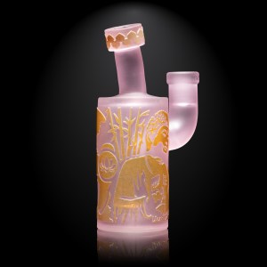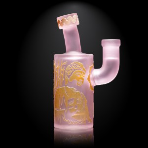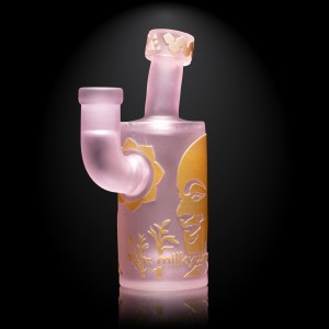 This 6″ rig is layered with fine silver frit glass and sandblasted deep. It contains a mini showerhead perc and hits a champ!