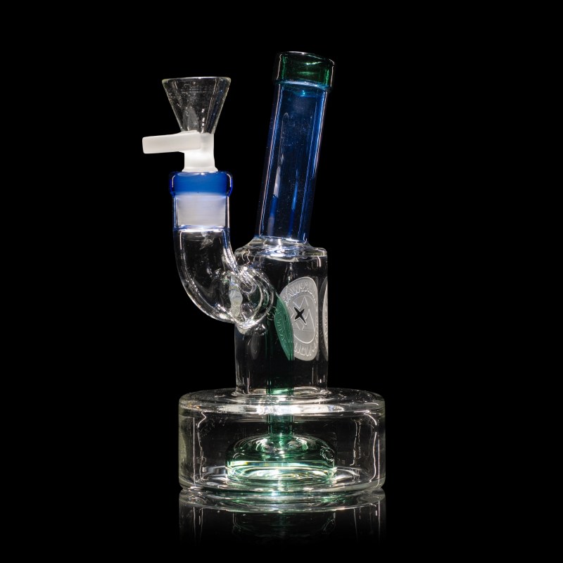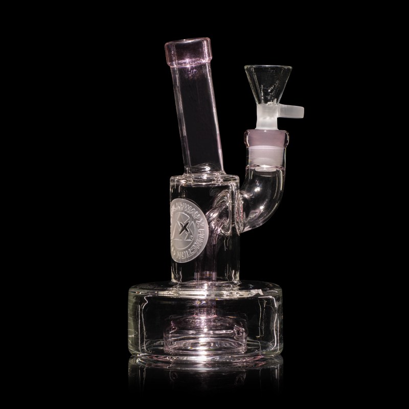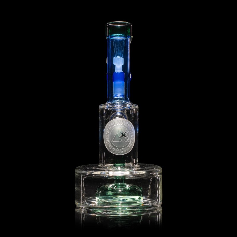 This piece features a puck base, creatively designed with diagonally aligned perc holes. These strategically placed holes induce water to swirl vigorously within the puck base, ensuring maximum filtration and the creation of rapid, sizable bubbles. Adorning the back is a meticulously double-layered Milkyway X motif, adding a bold and distinctive touch to its appearance.