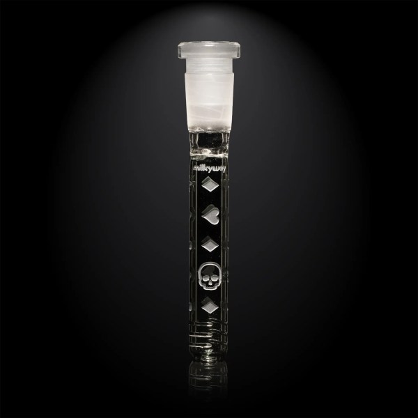 Enter the domain of the Skull Emperor—this 4.75-inch downstem is the perfect upgrade for any large beaker in the Skullduggery collection. Adorned with poker and skull motifs, it’s more than just a functional piece—it’s a statement of loyalty to the throne of bone.Crafted with a sturdy 3 mm thickness and a 18 mm joint, it’s built for our large beakers. Designed for optimized airflow and filtration, it delivers a smooth, consistent draw worthy of the undead court. The muted colorway is carefully chosen to complement the darker aesthetics of your setup.