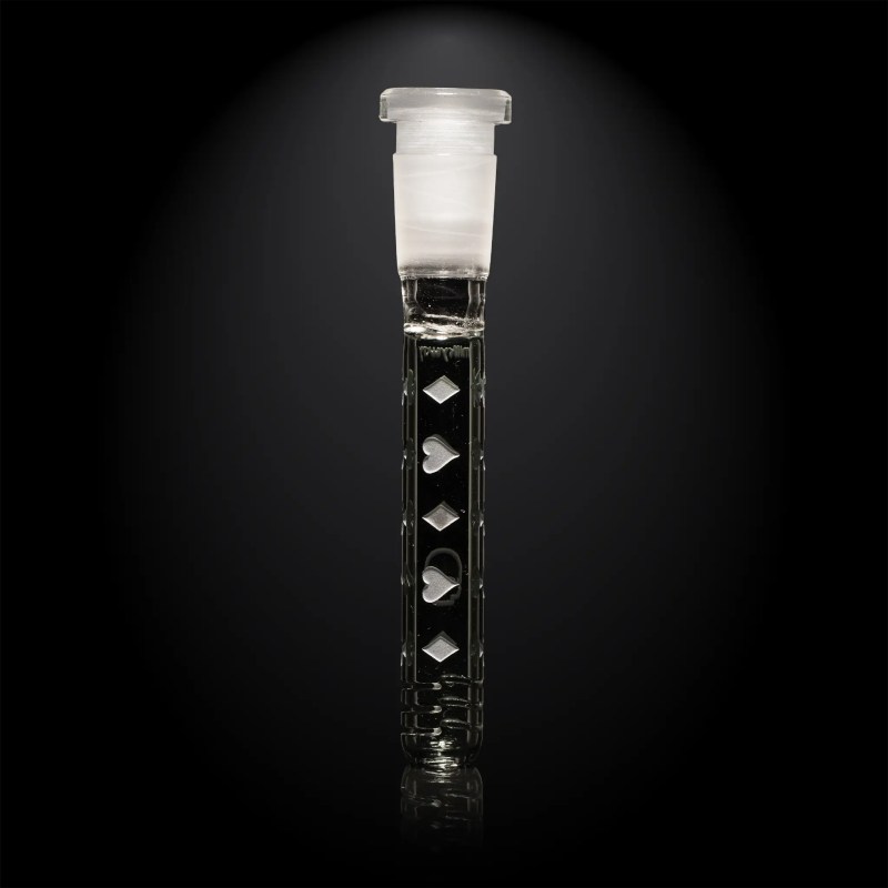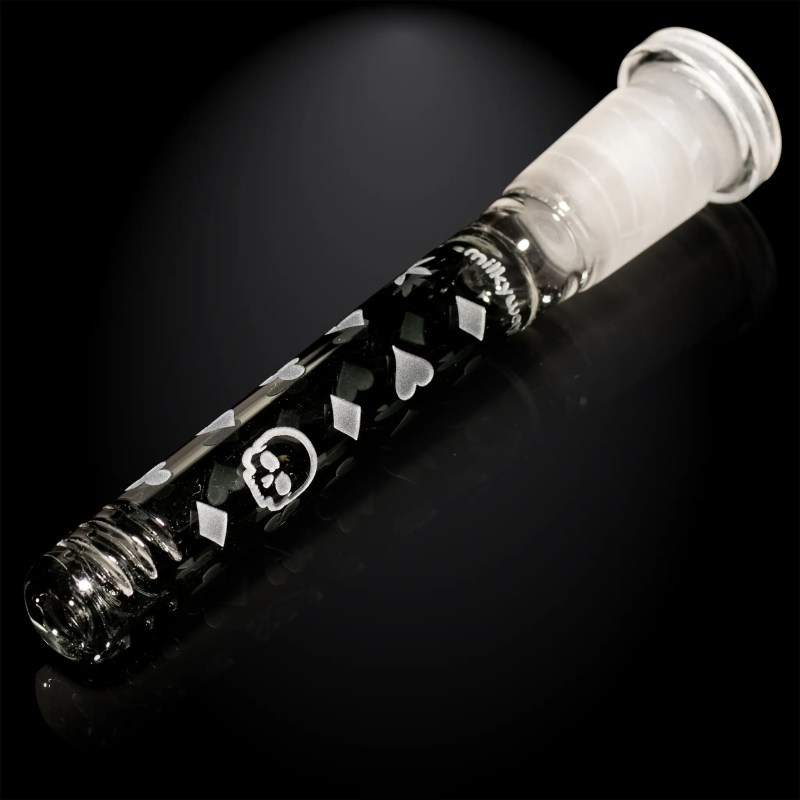 Enter the domain of the Skull Emperor—this 4.75-inch downstem is the perfect upgrade for any large beaker in the Skullduggery collection. Adorned with poker and skull motifs, it’s more than just a functional piece—it’s a statement of loyalty to the throne of bone.Crafted with a sturdy 3 mm thickness and a 18 mm joint, it’s built for our large beakers. Designed for optimized airflow and filtration, it delivers a smooth, consistent draw worthy of the undead court. The muted colorway is carefully chosen to complement the darker aesthetics of your setup.