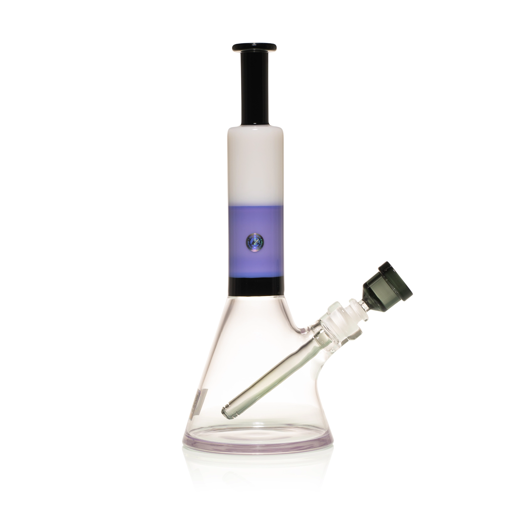 This 14″ beaker is crafted from opaque furnace-made colored glass tailored specifically for this piece. It’s a classic beaker with the narrower mouthpiece for a comfortable draw.