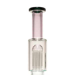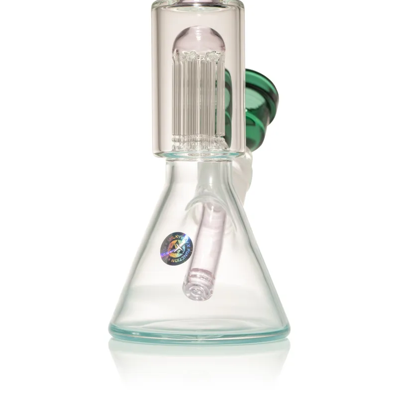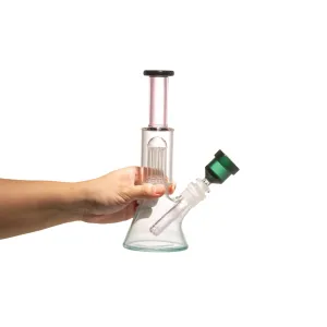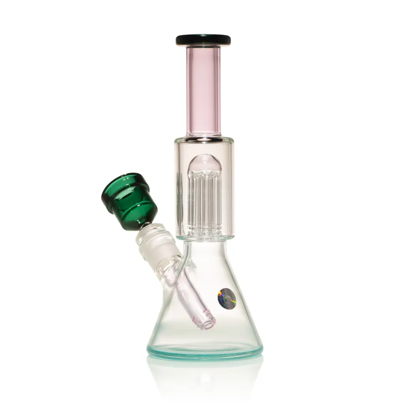 This elegant 9” beaker showcases a perfectly balanced design, highlighted by complementary colored glass sections that create a bold yet harmonious visual statement.